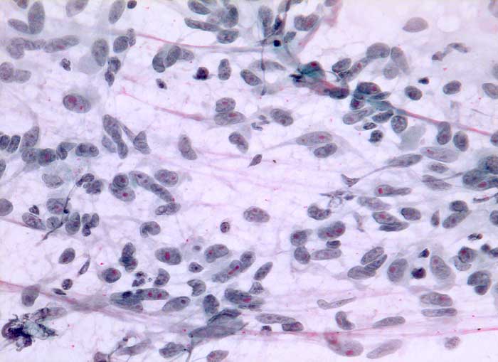 Melanome metastasieren häufig in die Lymphknoten. Sie können morphologisch sehr unterschiedlich aussehen. Melanome erscheinen zytologisch teils wie ein Sarkom, teils wie ein Karzinom. Die Tumorzellen können Pseudoverbände ähnlich einem Karzinom bilden. In zellreichen Aspiraten erkennt man oft Kapillarachsen, denen die Tumorzellen in mehreren sich gegen peripher auflockernden Schichten anliegen, so dass ein garbenartiges Muster entsteht, wie man es auch bei Sarkomen beobachten kann. Prominente Nukleolen und intranukleäre Vakuolen sind oft vorhanden. Melanotische Metastasen sind aufgrund des Melaninpigmentes leicht diagnostizierbar. Bei amelanotischen Metastasen kann eine immunzytochemische Untersuchung mit S-100 und/oder HMB-45 weiterhelfen.