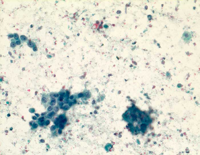 Das DCIS zeigt im Gegensatz zur atypischen Hyperplasie eher diskohäsive Verbände und Einzelzellen. Bei der atypischen Hyperplasie sind gutartige Zellelemente beigemischt und die Verbände können irreguläre oder schlitzartige Lumina enthalten.