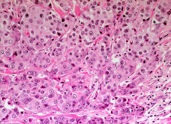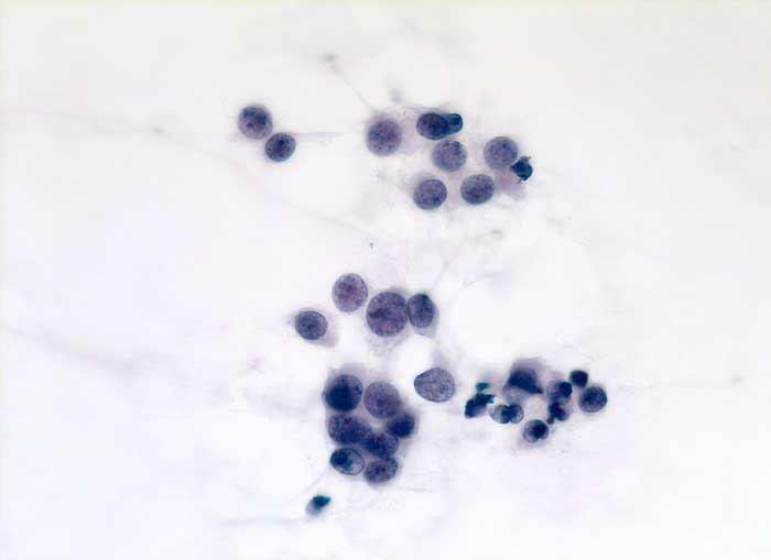 Das invasive Mammakarzinom zeigt zytologisch eine homogene Population maligner Zellen. Typischerweise sollten die Ausstriche zellreich sein und alle vorhandenen Zellen sollten maligne aussehen. Wenn man atypische Zellen suchen muss, ist der Ausstrich nicht diagnostisch für ein Karzinom, kann aber gleichwohl verdächtig sein. Die malignen Zellen sind in lockeren Gruppen gelagert und viele liegen einzeln. Crowding, Zellkannibalismus und Kernmolding sind gute Hinweise auf Malignität. Myoepithelien sind meistens aber nicht immer abwesend. Mammakarzinomzellen sind eher monomorph und deutlich grösser als normale duktale Epithelien. Zellkerne, die grösser sind als zwei Erythrozytendurchmesser, sind tumorverdächtig. Fast immer sind Kerbungen der Zellmembran nachweisbar. Das Chromatin ist im Gegensatz zu anderen Adenokarzinomen fein granulär und gleichmässig im Kern verteilt. Nukleolen sind meist unscheinbar. Makronukleolen sprechen für ein invasives Karzinom.