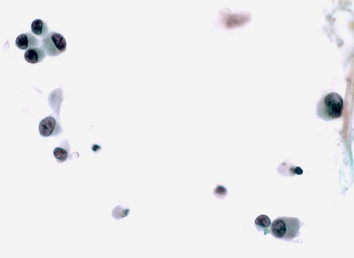 Die Ausstriche der invasiven lobulären Karzinome sind meist zellarm (ausgeprägte Desmoplasie). Die monomorphen Tumorzellen sind kaum grösser als normale duktale Epithelien. Die exzentrisch gelagerten Kerne sind rundlich und nur wenig atypisch. Nukleolen sind selten zu sehen. Das Zytoplasma enthält manchmal eine Vakuole, die den Kern einbuchtet und der Zelle einen Siegelringaspekt verleiht. Bei diesen Zytoplasmaeinschlüssen handelt es sich aber nicht um Schleimvakuolen, sondern um Zisternen. Die Tumorzellen liegen einzeln, in losen Gruppen oder bilden zeilenförmige Verbände („indian files“). Aufgrund des geringen Zellgehaltes und der gering ausgeprägten Zellatypien ist die Diagnose des lobulären Karzinoms am zytologischen Ausstrich schwierig. Invasive Karzinome vom lobulären und duktalen Typ sind zytologisch schwierig zu unterscheiden. Der Tumorsubtyp wird deshalb in der Regel in der Diagnose nicht angegeben.