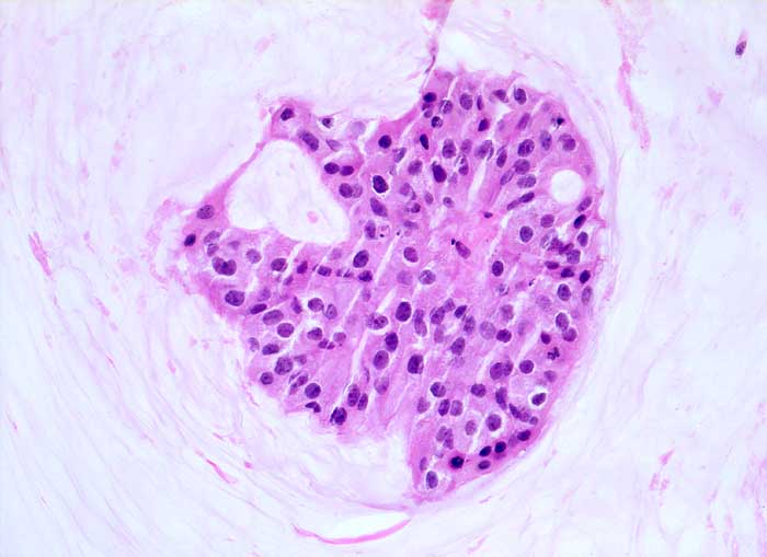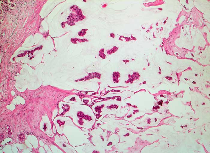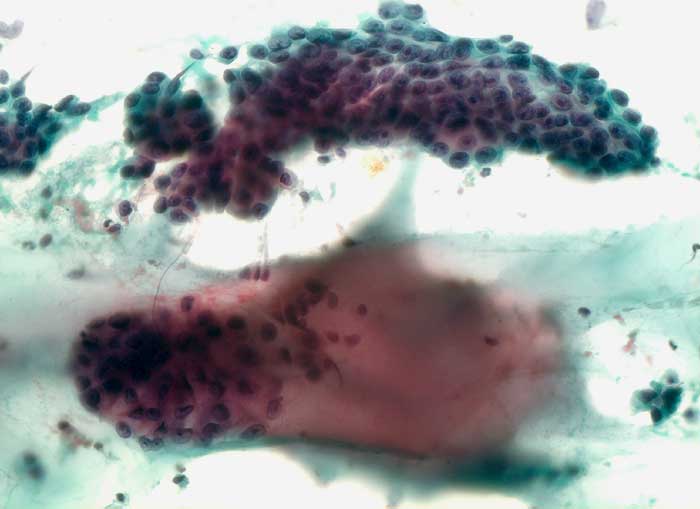 Homogene oder schlierenförmige extrazelluläre Schleimmassen mit Inseln von Tumorzellen mit geringen Kernatypien sind pathognomonisch für das muzinöse Mammakarzinom. Die Zellzahl ist meist nicht sehr hoch. Die Zellen liegen einzeln oder in kleinen kugeligen oder pseudopapillären Verbänden. Der Schleim erscheint in der Pap Färbung blau-grau bis rötlich. Siegelringkarzinome zeigen grössere intrazytoplasmatische Schleimvakuolen.