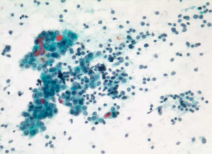 Das Zellbild wechselt in Abhängigkeit vom Stadium. Im floriden Anfangsstadium finden sich zahlreiche Lymphozyten, einige neutrophile Granulozyten und die pathognomonischen Epitheloidzellen und Riesenzellen, gelegentlich in granulomähnlichen Aggregaten. Die Follikelzellen können degenerative Veränderungen und eine deutliche Polymorphie aufweisen. Im Verlauf der Erkrankung nimmt die Zellularität ab. Bei eindeutigem zytologischem Befund kann auf eine histologische Abklärung verzichtet werden. Die Thyreoiditis De Quervain stellt keine Indikation für einen operativen Eingriff dar.