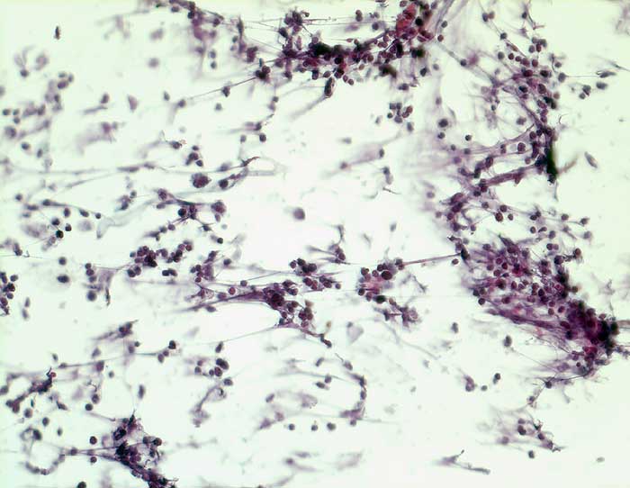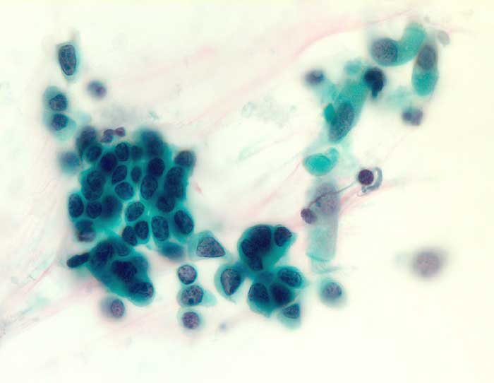Die Tumorzellen des kleinzelligen Karzinoms erscheinen in der Übersicht eher einförmig. Bei stärkerer Vergrösserung zeigt sich aber eine deutliche Polymorphie. Die Kerne sind rundlich, eckig oder spindelig und je nach Erhaltungszustand mehr oder weniger hyperchromatisch. Der Kernhintergrund ist dunkel und das Chromatin fein dispers. Nukleolen sind meist unscheinbar. Plumpe grosse Nukleolen sprechen eher für ein grosszellig neuroendokrines Karzinom, dessen Morphologie im Übrigen mit derjenigen des kleinzelligen Karzinoms überlappt. Die Abgrenzung von einem Lymphom oder aktivierten Lymphozyten kann schwierig sein.