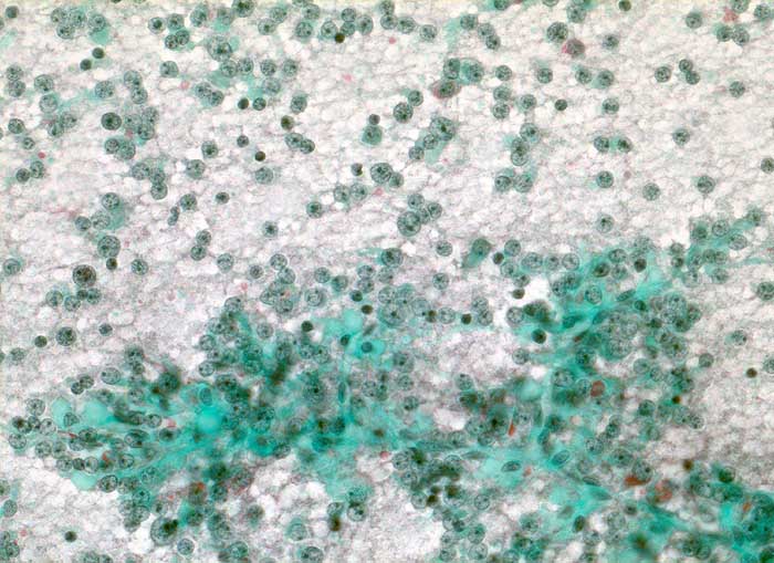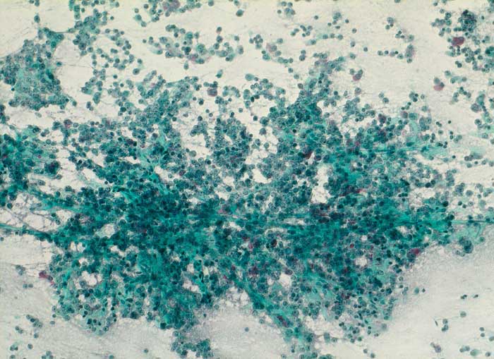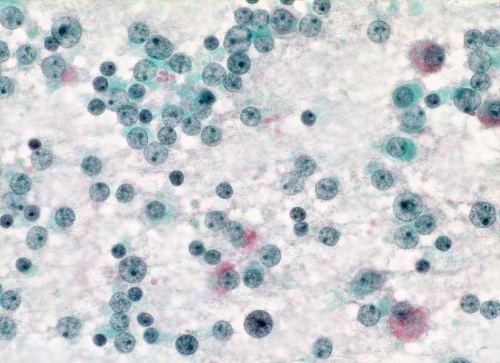 Die Ausstriche sind zellreich und die Zellen sind einzeln, in papillären Verbänden oder Gruppen angeordnet. Zytoplasma ist reichlich vorhanden und ist abhängig vom Typ des Adenoms eosinophil oder basophil. Im Gegensatz zum bunten Zellbild einer normalen Hypophyse wirken die Zellen des Adenoms eher gleichförmig. Die Kerne sind rund und monomorph, das Chromatin ist fein oder Pfeffer und Salz artig. Nukleolen sind meist klein, können aber auch prominent sein. Dignität und funktionelle Eigenschaften sind zytologisch nicht bestimmbar.