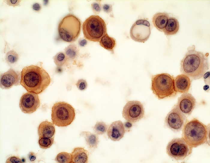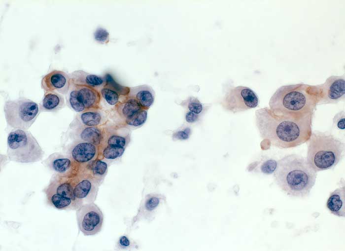 Unterscheidung von Adenokarzinomen und kleinzelligen Karzinomen (positiv) von benignen oder malignen Mesothelzellen im Erguss (negativ).