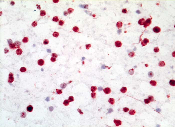 - Ki-67 (am Gefrierschnitt) bzw. Mib-1 (Paraffinmaterial) werden von proliferierenden Zellen in der späten G1, S, G2 und M Phase exprimiert, aber nicht in der G0 Phase. Stark proliferierende Gewebe zeigen einen hohen Ki-67 Index z.B. Keimzentren von reaktiven Lymphfollikeln.