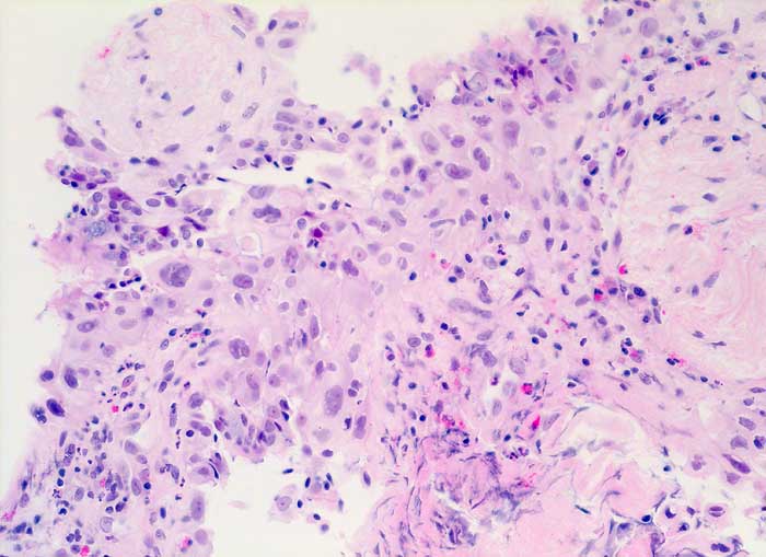Nach Strahlentherapie eines mediastinalen Tumors oder eines Bronchuskarzinoms zeigen Bronchial- und Alveolarepithel ähnliche Kernveränderungen wie nach Zytostatikatherapie. Die Flimmerzellen haben unterschiedlich stark vergrösserte oft hyperchromatische und entrundete Kerne, sowie fragiles Zytoplasma. Der Nachweis von Flimmerhaaren und die erhaltene Kern-Zytoplasmarelation sprechen für reaktiv veränderte Bronchialepithelien.