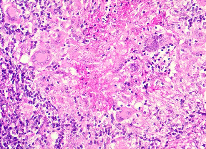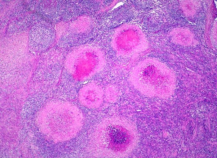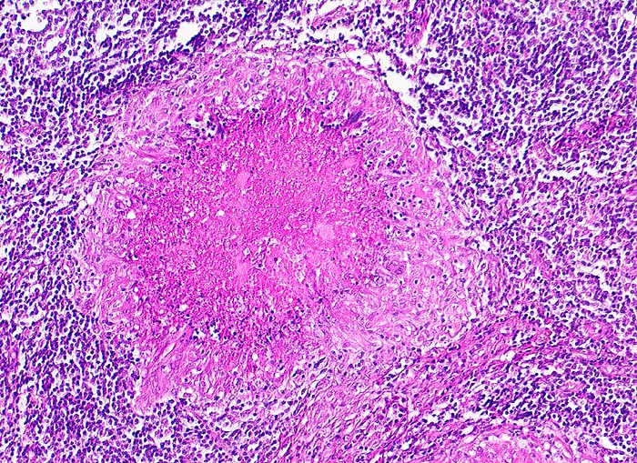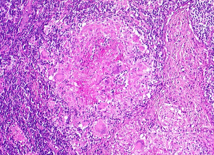 Morphologie: Bei der Tuberkulose sind meist verkäsende Granulome nachweisbar. Die atypische Mykobakteriose bildet lediglich angedeutete Granulome mit wenig Riesenzellen und keine oder minimale verkäsende Nekrosen. Bei immunsupprimierten Patienten finden sich grossleibige histiozytäre Zellen ( 3728), welche massenhaft säurefeste Stäbchen enthalten. Die histologische Unterscheidung von Mycobacterium tuberculosis und atypischen Mykobakterien gelingt jedoch nicht zuverlässig ( 726)( 264). Für die definitive Diagnose ist der kulturelle Nachweis notwendig, welcher allerdings bei atypischen Mykobakterien sehr schwierig ist.