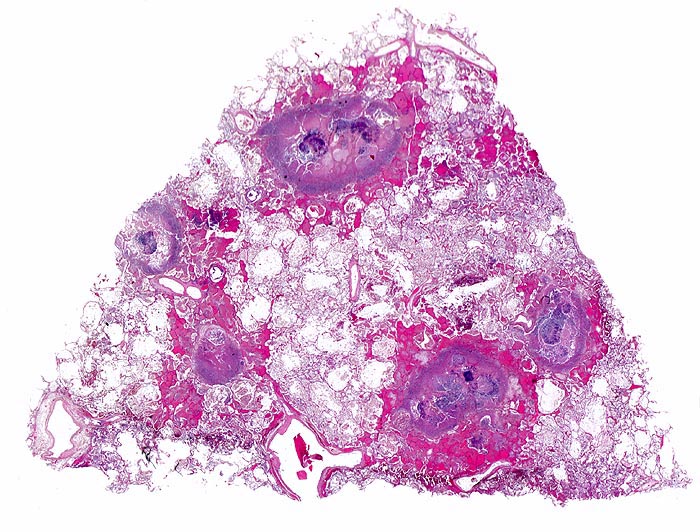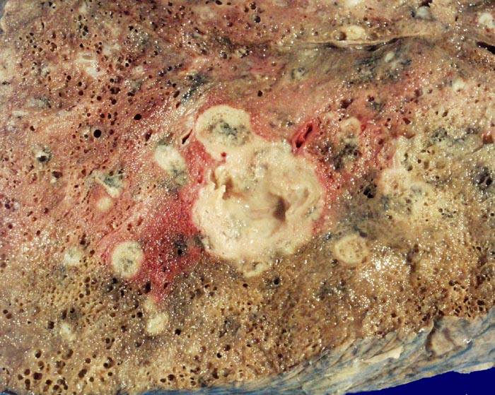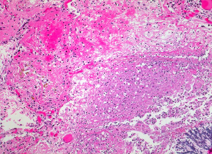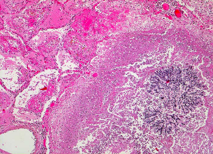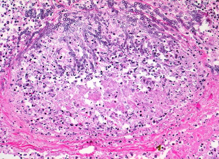 Aspergillus unterscheidet sich von anderen Pilzen ( 1462)( 712) durch häufige Verzweigungen der Hyphen in einem Winkel von 45°, die radiär in grossen Kolonien liegen ( 547)( 556). Besonders gut sind die Pilze in der PAS ( 717) und in der Grocott ( 189) Färbung nachweisbar. Die vier häufigsten durch Aspergillen hervorgerufenen Lungenerkrankungen sind die allergische bronchopulmonale Aspergillose, die chronische nekrotisierende Aspergilluspneumonie, das Aspergillom oder wie in diesem Fall die invasive Aspergillose. (Näheres zu den verschiedenen Krankheitsbildern im Literaturlink). Bei Immunsupprimierten invadieren die Pilze häufig die Gefässe. Dies führt zu Infarkten, Blutungen und Nekrosen der Lunge. Über die Invasion der Gefässe kommt es zur septischen Streuung ( 715)( 49) im grossen Kreislauf.