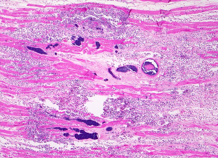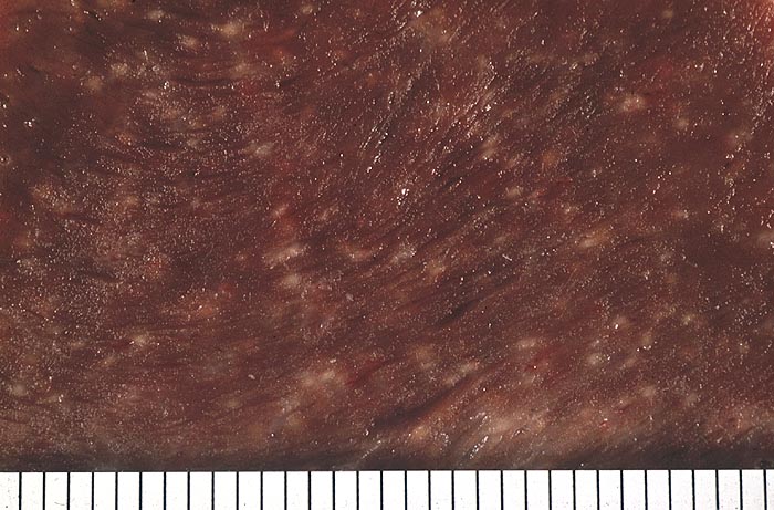 Die septikopyämischen Streuherde imponieren makroskopisch als eitrig abszedierende Entzündung, Gewebsnekrosen (> 2942) (> 2120) (> 2063), multiple kleine zentral abszedierte Rundherde mit einem roten Randsaum (> 2871)oder punktförmige Hämorrhagien (> 2943). Histopathologisch lassen sich Erreger in und um kleine Gefässe (> 191) nachweisen mit oder ohne Ausbildung von Mikroabszessen.