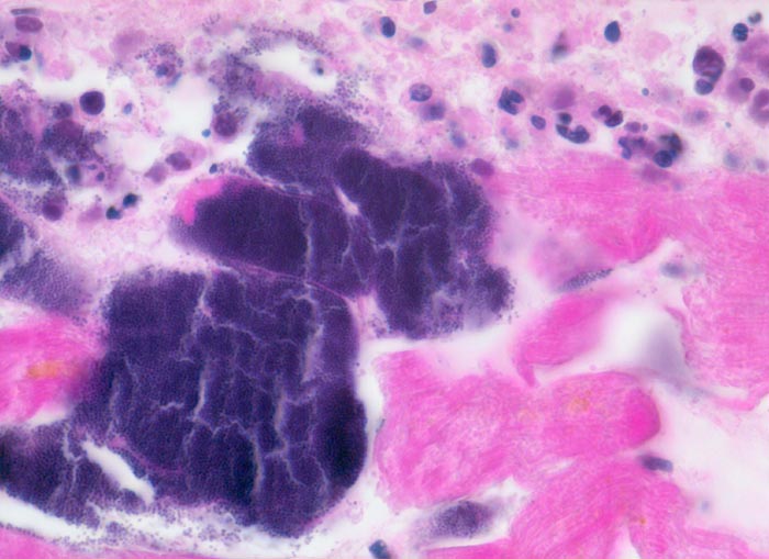 • Links unten im Bild sind mehrere Arterien mit intra- und perivaskulären Kokkenbakterien und neutrophilen Granulozyten erkennbar.