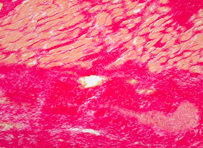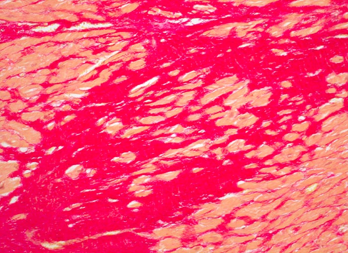 Herdförmiger Ersatz der Muskulatur durch zellarme rote Kollagenfaserbündel.