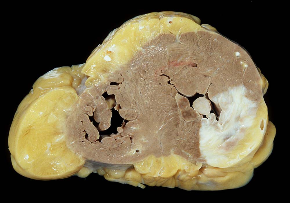 Eine restitutio ad integrum nach abgelaufener Myokardnekrose ist nicht möglich. Wird das Ischämieereignis überlebt, kommt es zu einer reparativen Regeneration mit Ersatz der Muskulatur durch kollagenreiches Narbengewebe. Dieser Vorgang setzt etwa ab dem 9. Tag nach Infarkt ein und dauert bis zur vollständigen narbigen Ausheilung bei transmuralem Infarkt etwa 50 Tage. Makroskopisch imponiert die Narbe als fasriges weisses derbes Areal. Von einem Infarkt spricht man, wenn die Nekroseareale einen Durchmesser von mindestens 3cm Durchmesser haben. Ab dieser Grösse kann klinisch das Bild eines Myokardinfarktes ausgelöst werden. Kleinere, makroskopisch sichtbare Narben werden als grobfleckige Myokardfibrose ( 873)( 234) bezeichnet.