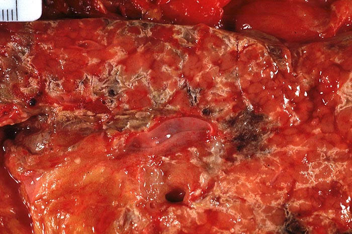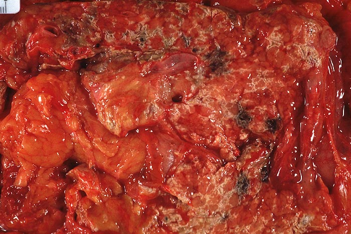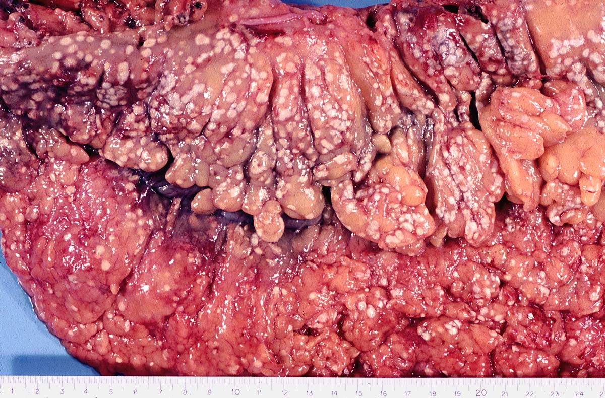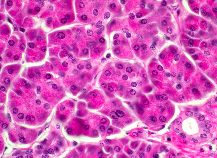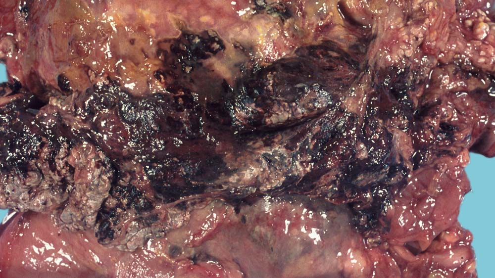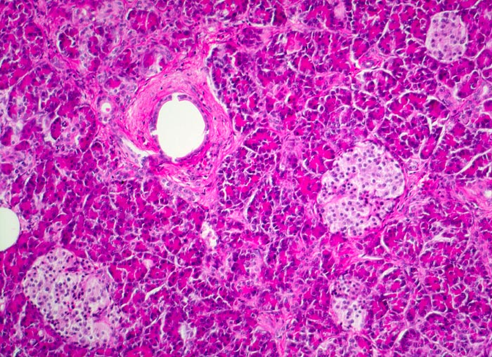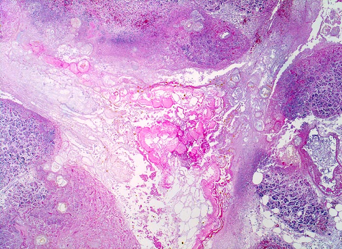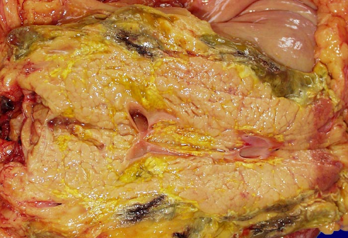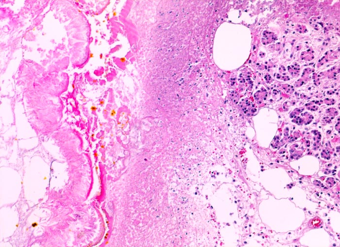 Das Spektrum reicht von Ödem und Infiltraten neutrophiler Granulozyten ohne oder mit kleinen Fettgewebsnekrosen bei der interstitiell-ödematösen Variante über großflächige hämorrhagische Nekrosen im peripankreatischen Fettgewebe und im Pankreasparenchym bei der nekrotisch-hämorrhagischen Variante (Kurspräparat). Das peripankreatische Fettgewebe wird bei der nekrotisch-hämorrhagischen Variante durchsetzt von grösseren Fettgewebsnekrosen mit Verseifung, die gesäumt werden von dichten Infiltraten neutrophiler Granulozyten teils mit Abszessbildung. Die Hämorrhagien kommen durch Wandnekrosen kleiner und mittelgrosser Venen im peripankreatischen Fettgewebe zustande.