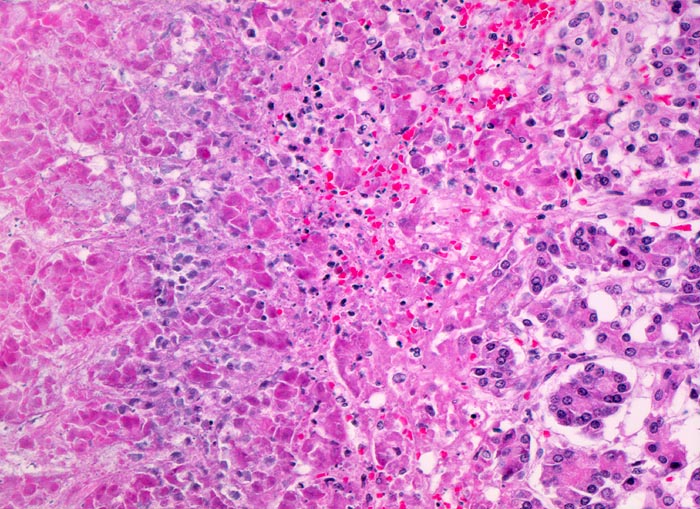 • Innerhalb der Nekroseareale Ablagerungen von amorphem gelborangem Hämatoidin (eisenfreies extrazelluläres Hämoglobinabbauprodukt).