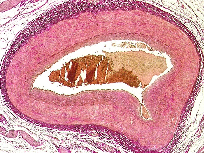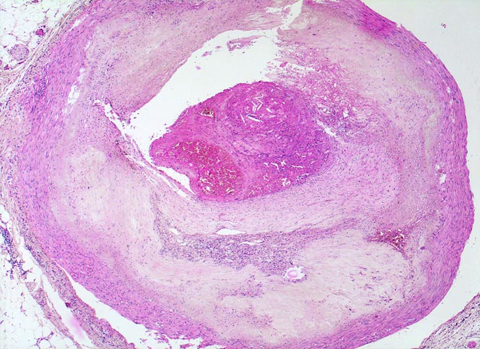 Der Thrombus kann klein und nicht-okklusiv ( 133)( 99) sein oder das Lumen vollständig verschliessen. Beide Formen können zum plötzlichen Herztod führen. Teile des Thrombus können sich lösen und zur Mikroembolisation in intramyokardiale Arterien führen. Detaillierte Untersuchungen der Koronararterien von Patienten mit schwerer Koronarsklerose zeigen häufig Fissuren und kleine Rupturen verschiedenen Alters. Wiederholte subklinische Plaquerupturen führen zur Plaqueprogression. Verheilte Plaquerupturen sind meist stabil.