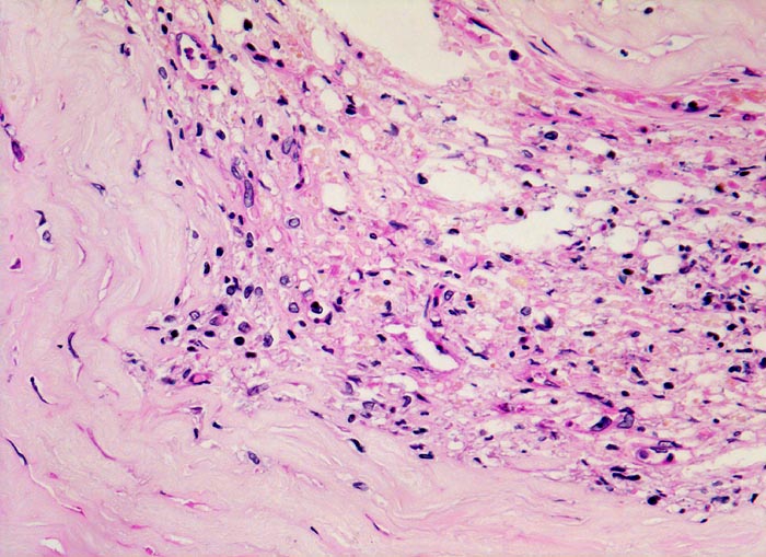 Mikroskopisch findet sich ein Kontinuitätsunterbruch in einer entzündlich veränderten fibrösen Deckplatte über einem Atherom. Dadurch gerät der lipidreiche Kern des Atheroms in Kontakt mit dem luminalen Blutstrom und dies führt zur Ausbildung eines Plättchen-Fibrin Thrombus und zur Einblutung in das Atherom. Meist zeigt der Thrombus Zeichen der beginnenden Organisation. Histologisch ist bei einer Ruptur die denudierte Endotheloberfläche von einem luminalen Thrombus bedeckt.