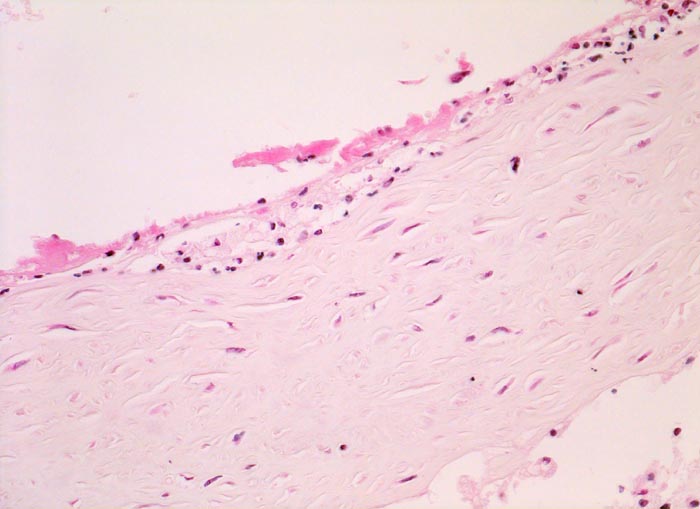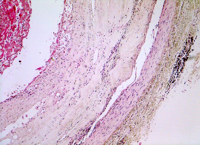 Organisierender geschichteter Abscheidungsthrombus über Defekt in der fibrösen Deckplatte. Der Thrombus enthält zusätzlich Atherombestandteile (Cholesterinkristalle und nekrotischer Detritus).