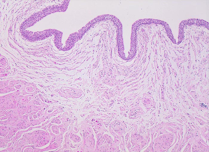 Histologisch sind die papillären Urothelkarzinome aufgebaut aus fingerförmigen, schlanken Papillen bedeckt von einem verbreiterten Urothel (mehr als 7 Zellagen breit) mit meist nur geringen zytologischen Atypien. Das subepitheliale Stroma ist per Definition nicht tumorinfiltriert.