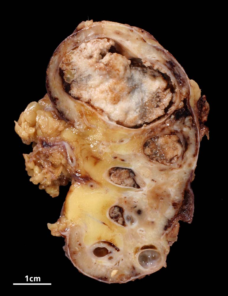 Die zweite Kategorie bilden die genetisch instabilen Tumoren (siehe Präparat 89,invasives Urothelkarzinom), welche die nicht invasiven papillären Karzinome mit schweren Epithelatypien (pTa G3), das Carcinoma in situ (pTis) und die invasiven Urothelkarzinome (pT1-4) umfasst. Invasive Karzinome entwickeln sich meist aus den genetisch instabilen high grade Läsionen. In diesen können zu einem frühen Zeitpunkt p53 Mutationen und im weiteren Verlauf zahlreiche weitere chromosomale Aberrationen inklusive high level Genamplifikationen nachgewiesen werden. Mehr als 90% dieser genetisch instabilen Tumoren sind aneuploid.