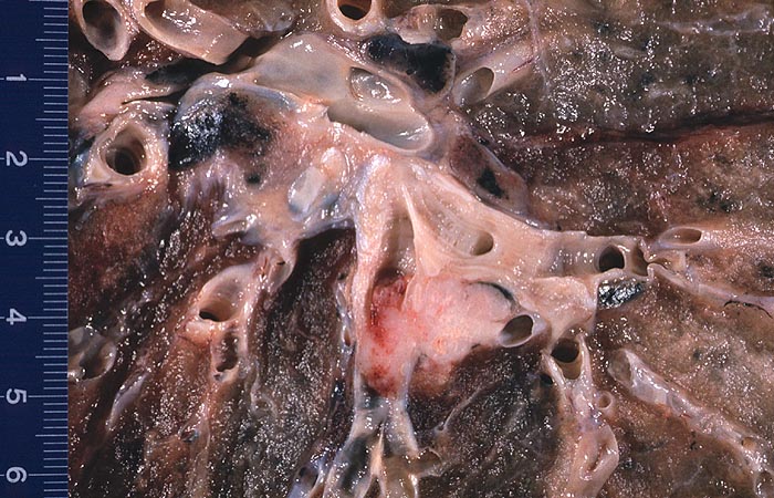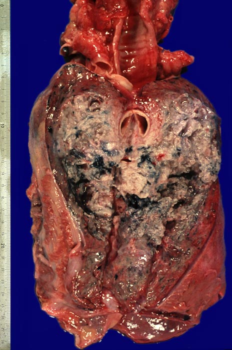 Etwa 70% der Lungenkarzinome liegen zentral. Ausgangspunkt sind vor allem die Teilungsstellen der Segment- und Subsegmentbronchen, seltener der Lappen- oder Hauptbronchen. Die rund 25% peripheren Karzinome bilden oft radiologisch erkennbare Rundherde ohne Beziehung zu einem grösseren Bronchus. Adenokarzinome entwickeln sich bevorzugt peripher (> 2811), kleinzellige Karzinome hingegen eher zentral.