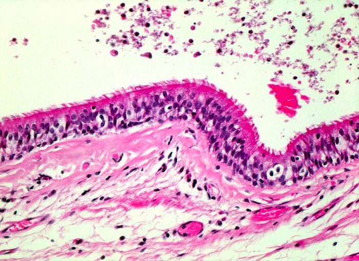 • Mehrere kleine Biopsiefragmente, teils bedeckt von respiratorischem Flimmerepithel. Submuköse Schleimdrüsen ohne zelluläre Atypien.