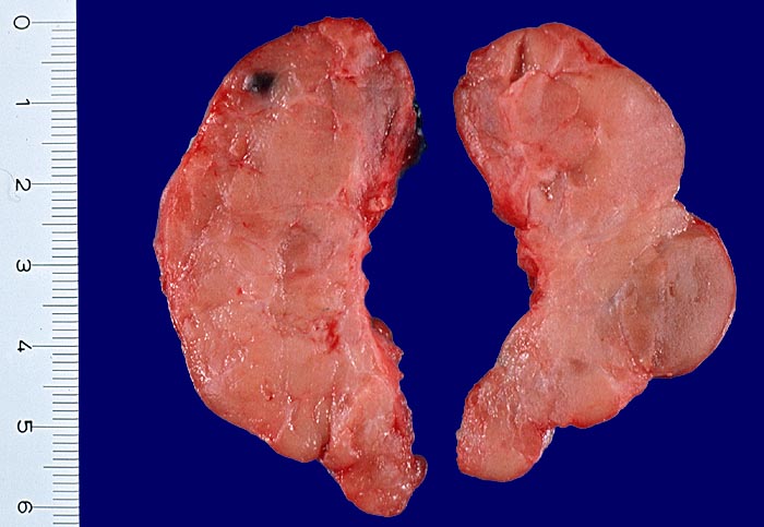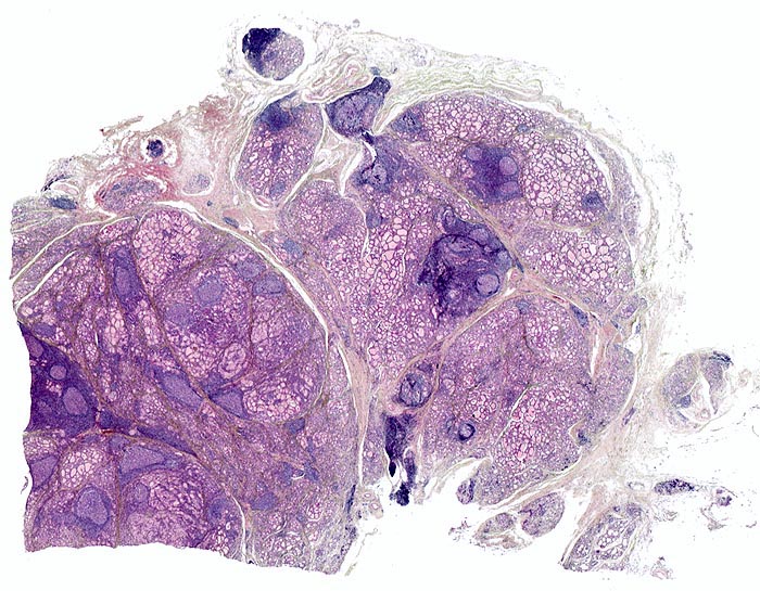 • Leicht fibrosiertes, knotiges mikrofollikuläres Schilddrüsenparenchym.