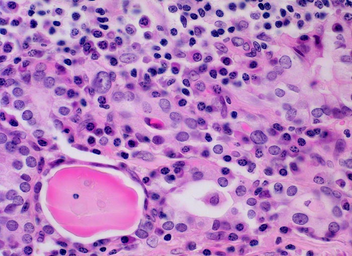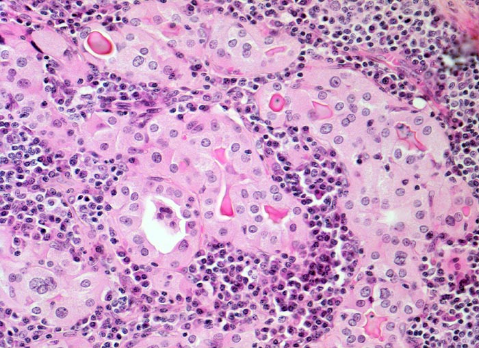 • Follikelepithel mit reichlich feingranulärem Zytoplasma (= oxyphile syn. onkozytäre Epitheltransformation) und reaktiven Kernatypien (einzelne vergrösserte hyperchromatische Kerne). Das sollte der Kliniker dem Pathologen mitteilen: