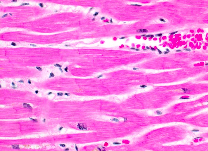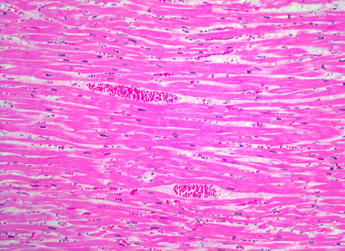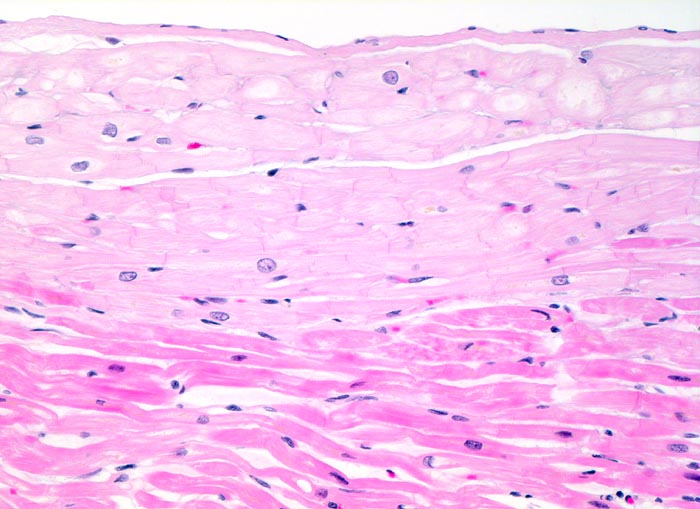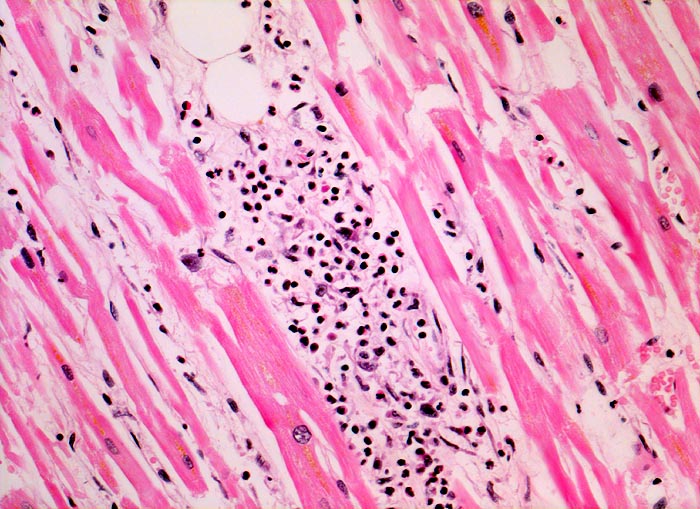 Einzelne Herzmuskelzellen werden durch das Entzündungsinfiltrat zerstört und sind hypereosinophil (Myozytolyse).