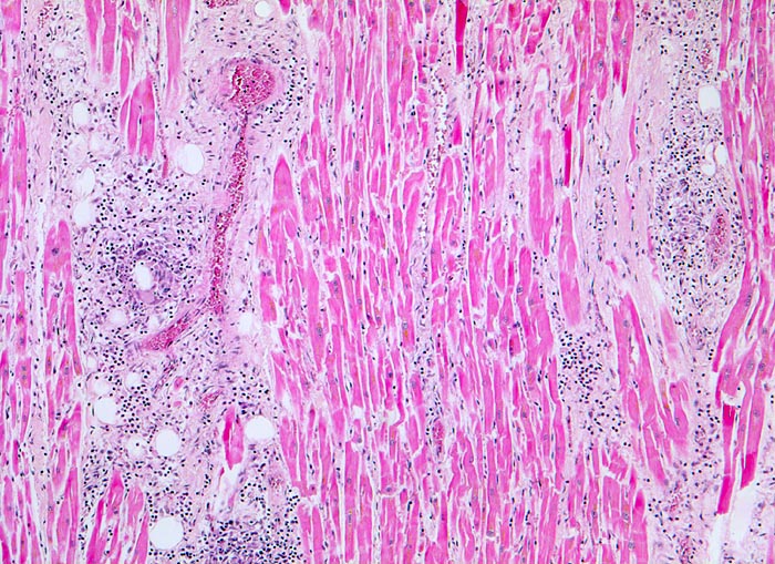 Aetiologie: Man unterscheidet infektiöse und nicht infektiöse Ursachen. Am häufigsten ist die Assoziation mit einem viralen Infekt (primär kardiotrope Enteroviren vor allem Coxsackievirus B oder nicht kardiotrope Viren im Rahmen einer allgemeinen Virusinfektion). Bakterien, Pilze, Protozoen, Helminthen, Chemikalien, Umweltgifte (Blei, Arsen, Kohlenmonoxid), Bestrahlung und verschiedene Systemerkrankungen (SLE, Riesenzellarteriitis) können ebenfalls eine Myokarditis verursachen. Die Hypersensitivitätsmyokarditis wird in Zusammenhang mit einer Überempfindlichkeitsreaktion auf verschiedene Medikamente beobachtet (Penicillin, Ampicillin, Hydrochlorothiazid, Methyldopa, Sulfonamide…). Typisch ist ein gemischtes Entzündungsinfiltrat aus Lymphozyten, Plasmazellen, Makrophagen und auffallend vielen eosinophilen Granulozyten. Zahlreiche Medikamente verüben wahrscheinlich einen direkten dosisabhängigen toxischen Effekt auf das Myokard (Lithium, Doxorubicin, Kokain, Catecholamine, Acetaminophen, Anthrazyklin, Zidovudin…). Die Riesenzellmyokarditis ist eine seltene idiopathische Erkrankung, charakterisiert durch eine massive Destruktion der Herzmuskelzellen durch mehrkernige Riesenzellen in Begleitung von Lymphozyten, Plasmazellen und eosinophilen Granulozyten ( 9757)( 9756). Weitere nicht infektiöse Formen der Myokarditis sind die hypereosinophile Myokarditis, die rheumatische Myokarditis im Rahmen eines rheumatischen Fiebers und die granulomatöse Myokarditis bei Sarkoidose ( 10020).