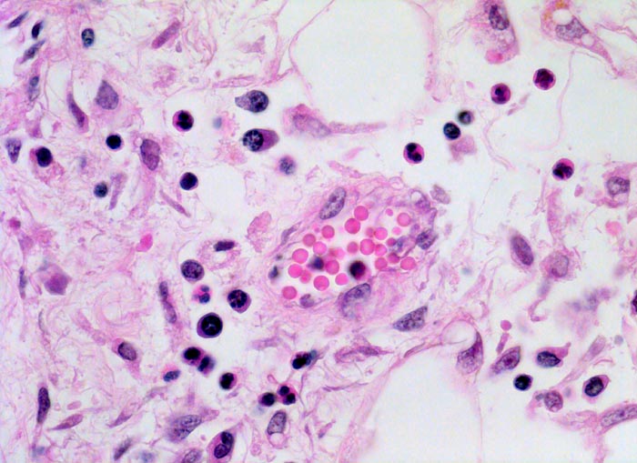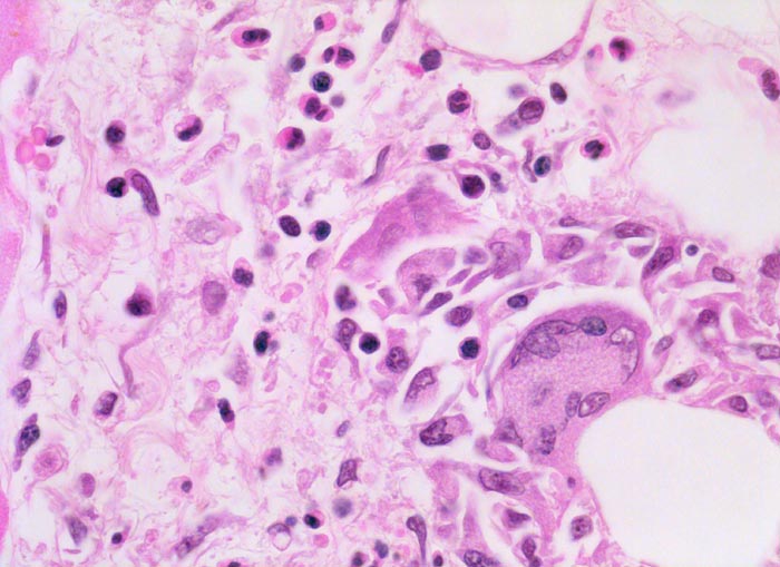 Teils fleckförmiges, teils diffuses gemischtes Entzündungsinfiltrat aus Lymphozyten, Plasmazellen, Makrophagen und zahlreichen eosinophilen Granulozyten.