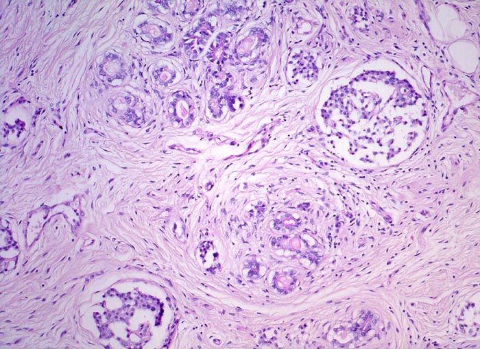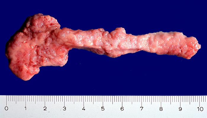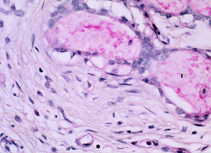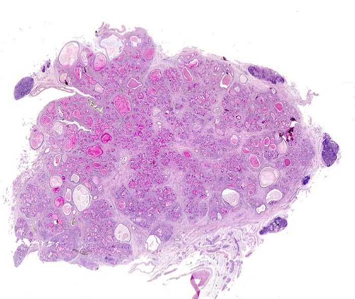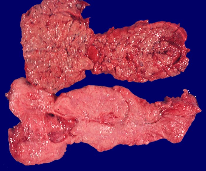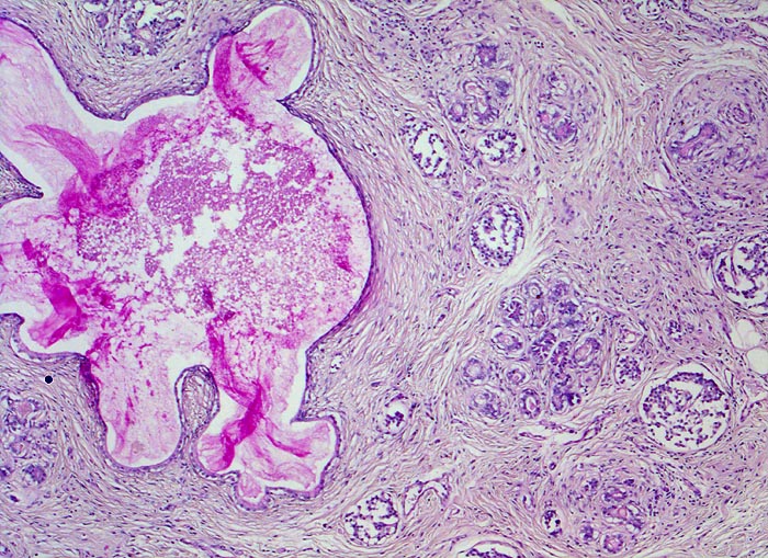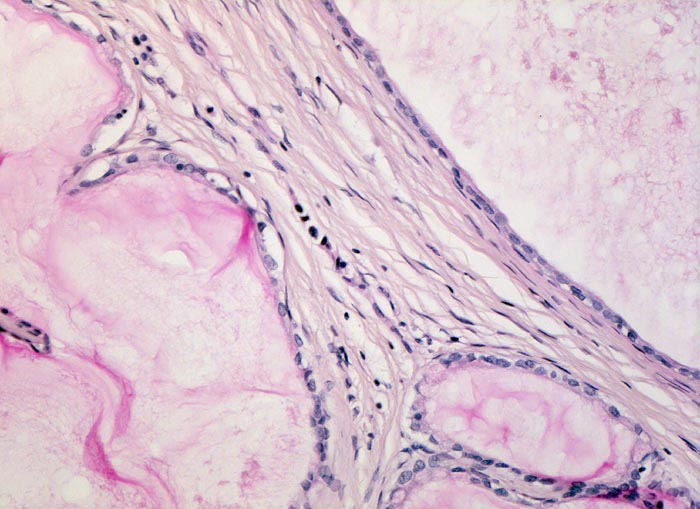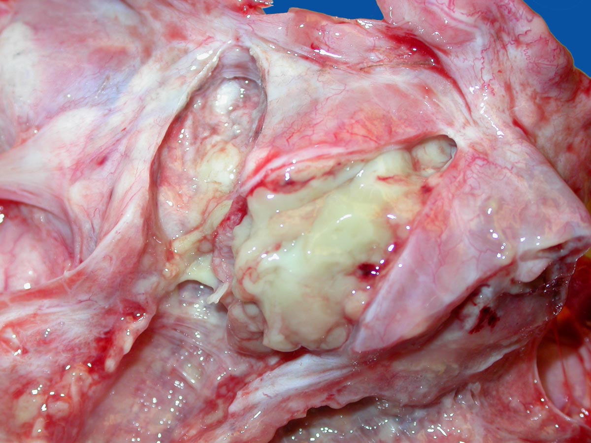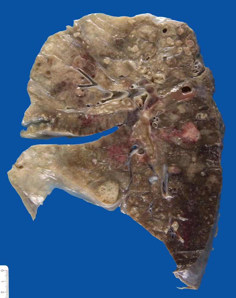 Fast alle exokrinen Drüsen sind betroffen. Pankreasgänge, intestinale Drüsen, intrahepatische Gallengänge und die Glandula submandibularis sind obstruiert durch visköses oder solides eosinophiles Material. Tracheobronchiale und Brunner’sche Drüsen bilden vermehrten Schleim. Schweissdrüsen, kleine Speicheldrüsen und Glandula Parotis sind histologisch normal, sezernieren aber vermehrt Natrium und Chlorid. Veränderungen in der Lunge ( 3689) entwickeln sich als Folge von Luftwegsobstruktion und Infekten (initial vor allem mit Staphylococcus aureus, später meist Pseudomonas aeruginosa).