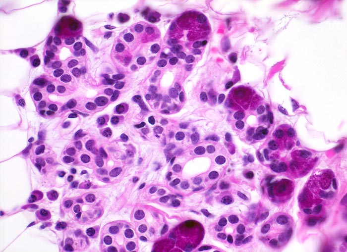 - Tubuli mit zentralem Lumen werden ausgekleidet von einer inneren helleren Epithelschicht und einer äusseren dunkleren Myoepithelschicht.