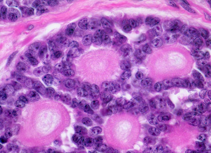- Mikrozystische Hohlräume in den kribriformen Tumorarealen enthalten eosinophiles hyalines Material.