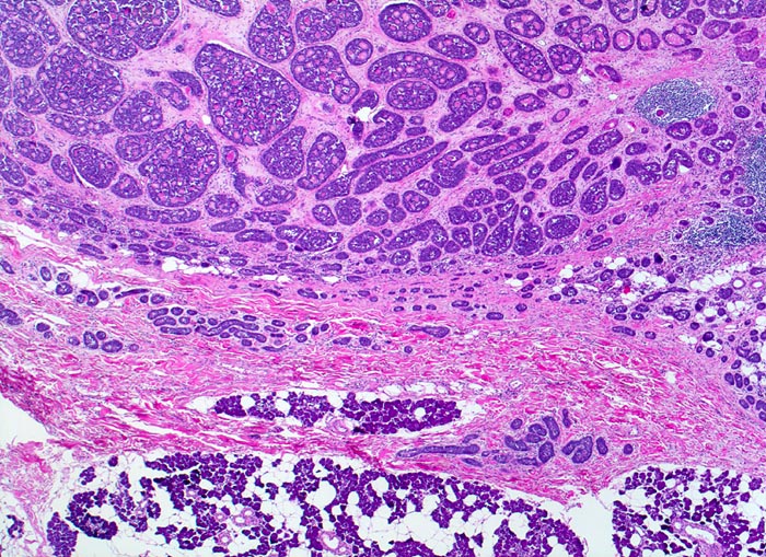 Adenoidzystische Karzinome zeigen drei Wachstumsmuster (in abnehmender Reihenfolge): kribriform, tubulär und solide. Die Hohlräume in den kribriformen Arealen entsprechen keinen echten Drüsenlumina, sondern sind Bestandteil des Tumorstromas. Sie enthalten PAS positives Sekret oder hyaline Substanzen. Die strangförmigen Tubuli begleitet von hyalinem Stroma. Typischerweise (allerdings nicht im vorliegenden Präparat) kann eine Perineuralscheideninvasion nachgewiesen werden. Kleine Tumoren können scharf begrenzt sein, grössere Tumoren wachsen infiltrativ.