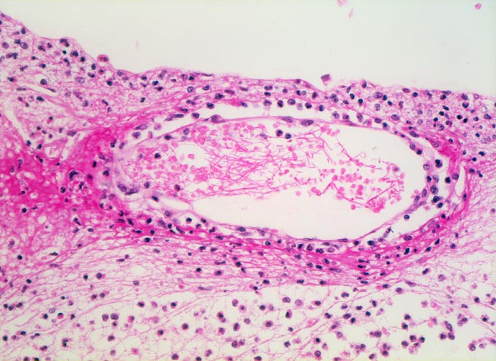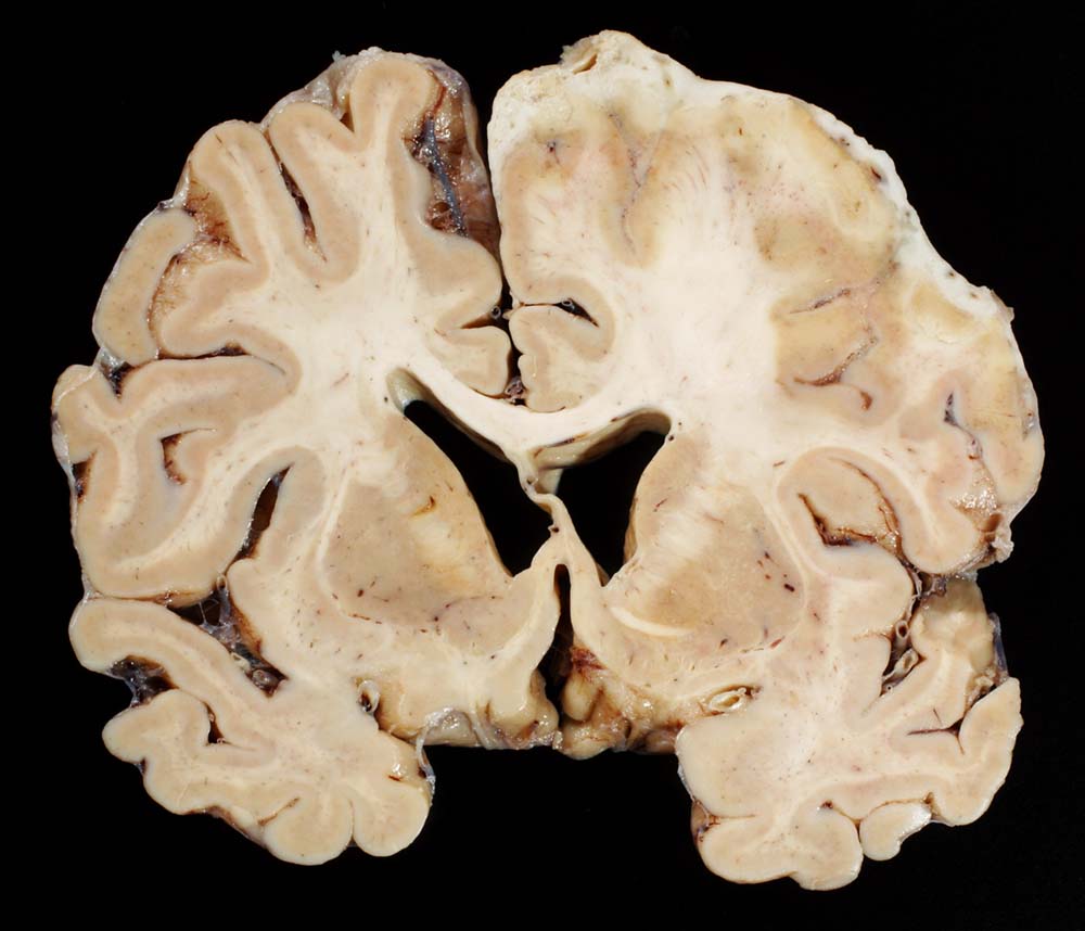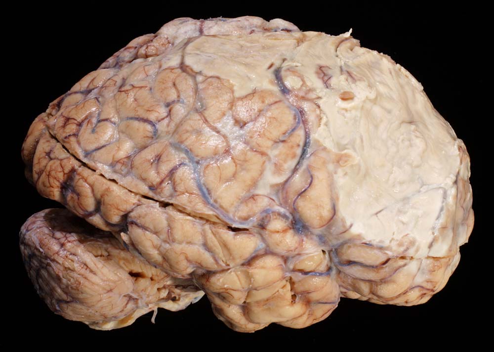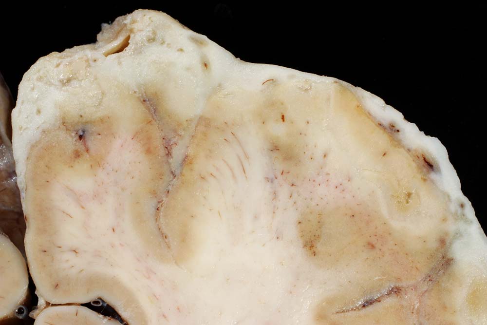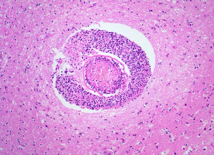 Der makroskopische Befund bei bakterieller Meningitis kann sehr diskret sein. Die meningealen Gefässe sind hyperämisch und die Hirnoberfläche wird von einem grüngelben Eiterbelag bedeckt (eher basal bei Hämophilus influenzae, eher über der Konvexität bei Pneumokokken=Haubenmeningitis). Histologisch ist der Subarachnoidalraum mit Eiter gefüllt. Bei weniger schweren Fällen finden sich die neutrophilen Granulozyten bevorzugt um die leptomeningealen Gefässe.