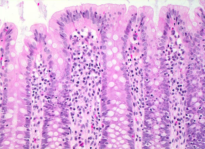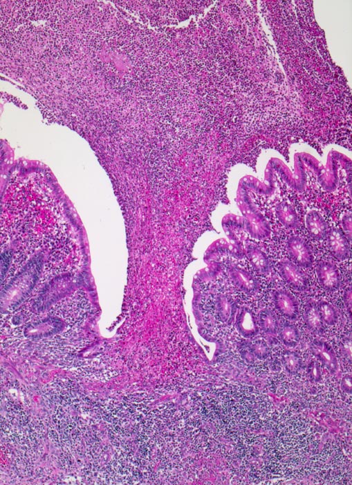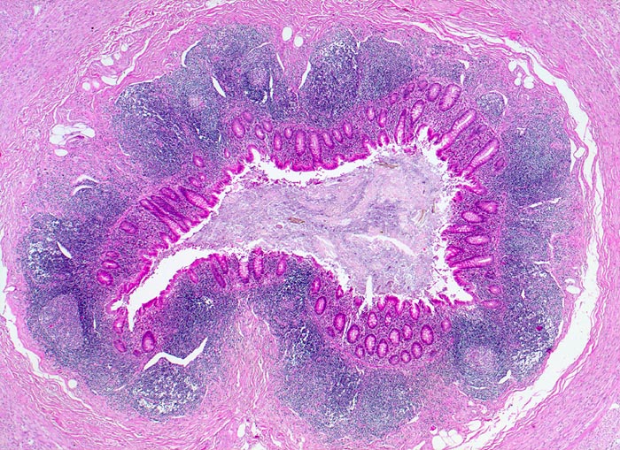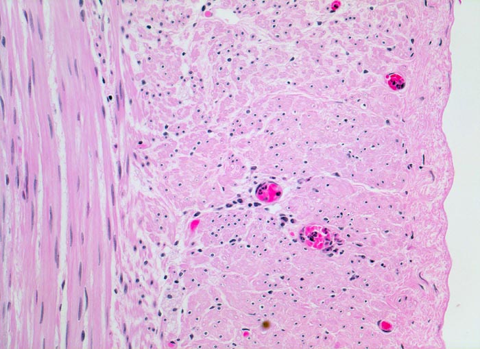 Morphologie: Das histologische Kriterium für eine akute Appendizitis ist die Infiltration der Muscularis propria mit neutrophilen Granulozyten.