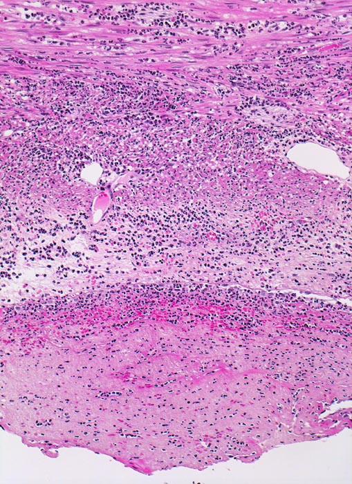 Diffuse Durchsetzung der Appendixwand mit neutrophilen Granulozyten (phlegmonöse Entzündung).