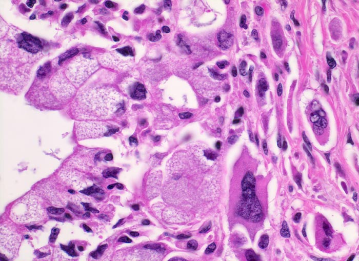 können sehr ähnlich aussehen wie eine chronische Pankreatitis ( 4243). Im Gegensatz zur Pankreatitis sind die neoplastischen Drüsen verformt oder rupturiert und zeigen zelluläre Atypien (grosse polymorphe Kerne mit prominenten Nucleolen). Die Tumordrüsen sind unregelmässig im Stroma angeordnet und nicht lobulär wie in der Pankreatitis. Nicht selten ist eine Nervenscheideninvasion nachweisbar ( 5884). Gelegentlich zeigen die Gänge im tumorfreien Parenchym dysplastische Veränderungen oder der Tumor breitet sich intraduktal entlang des Pankreasganges aus.