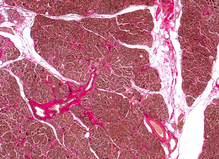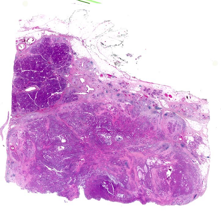 Rechts oben Reste von nicht neoplastischem Pankreasparenchym mit fokaler chronisch obstruktiver Pankreatitis als Folge von tumorbedingten Gangobstruktionen: Vollständige Atrophie des exokrinen Pankreas bei erhaltenen Inseln. Ersatz des atrophen Parenchyms durch Fibrose. Chronisches Entzündungsinfiltrat.