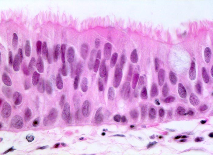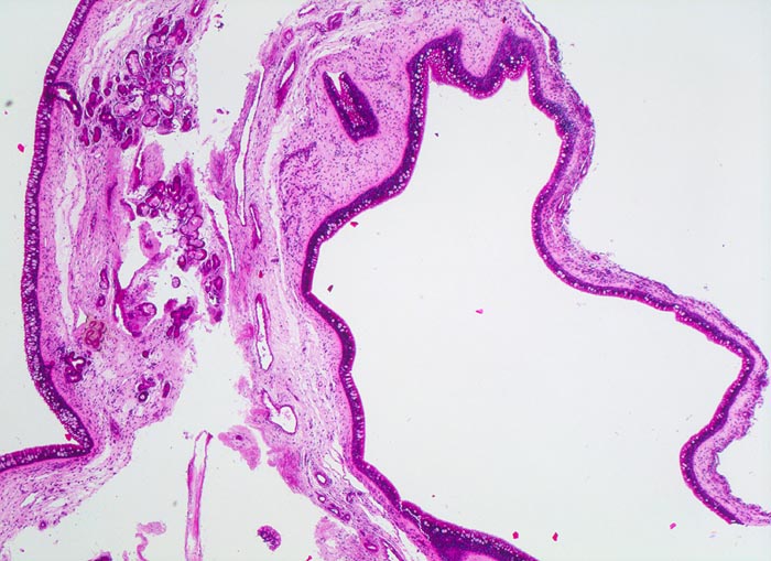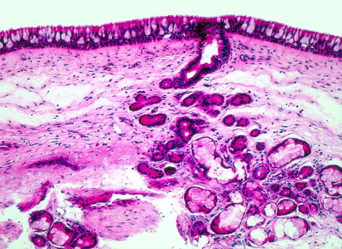 Histologisch sind die Polypen von einem respiratorischen Epithel ( 4380) ausgekleidet. Die Basalmembran ist verdickt und das Stroma ödematös. Eosinophile Granulozyten sind bei 80-90% der Polypen nachweisbar. Vermehrte Plasmazellen, Lymphozyten und Myofibroblasten kommen oft vor. Infiltrate von neutrophilen Granulozyten treten auf bei Mukoviszidose, ziliärer Dyskinesie und dem Young Syndrom. Diese Polypen sprechen kaum auf Steroidtherapie an.