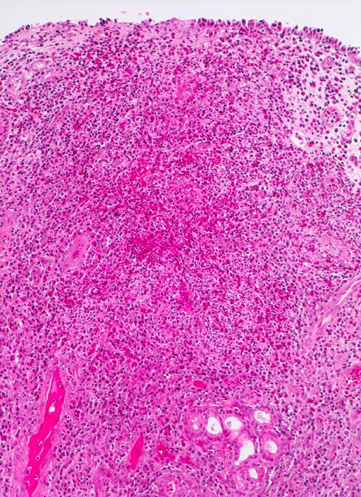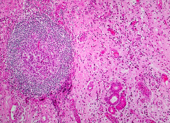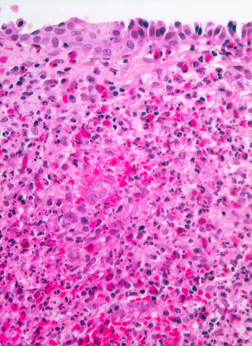Ödematöses Stroma mit gemischtem Entzündungsinfiltrat: Lymphozyten, Plasmazellen, Histiozyten und zahlreiche eosinophile Granulozyten.