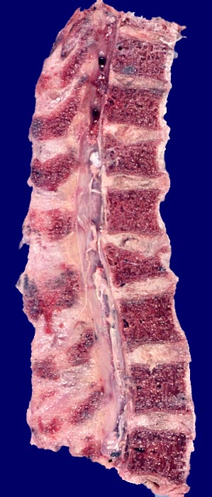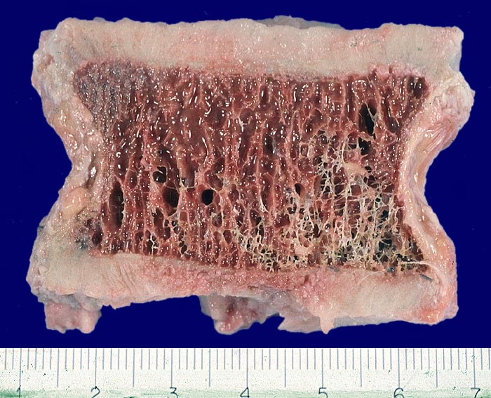 Makroskopisch fällt eine Rarefizierung der Spongiosa und eine erhöhte Maschenweite des Bälkchengerüstes auf (Röntgenbild: Verminderung der Knochendichte erst ab etwa 30% Knochenmasseverlust sichtbar!). Die Rarefizierung betrifft zunächst die weniger stark druckbelasteten Bälkchen (in den Wirbelkörpern die horizontalen Trabekel). Oft finden sich multiple Kompressionsfrakturen der Wirbelkörper mit Fischwirbelbildung. Histologisch sind eine Verschmälerung der Kompakta und verminderte Vernetzung der verdünnten Spongiosabälkchen sowie Mikrokallusbildungen (> 3286) nachweisbar.