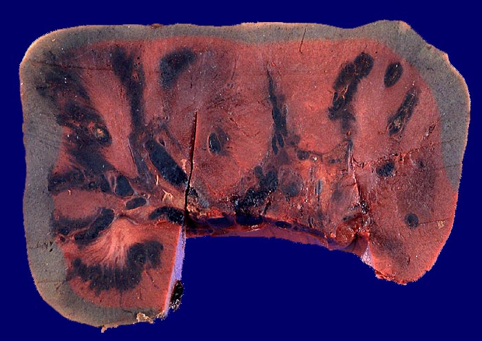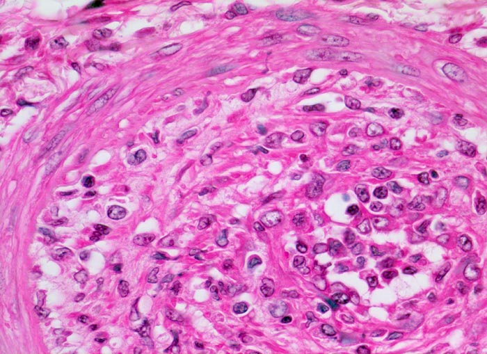 • Eine von 6 grossen bzw. mittelgrossen Interlobulararterien mit segmental verbreiterter, fibrosierter Intima mit Myofibroblasten und mit subendothelial gelegenen Leukozyten (Endothelialitis)