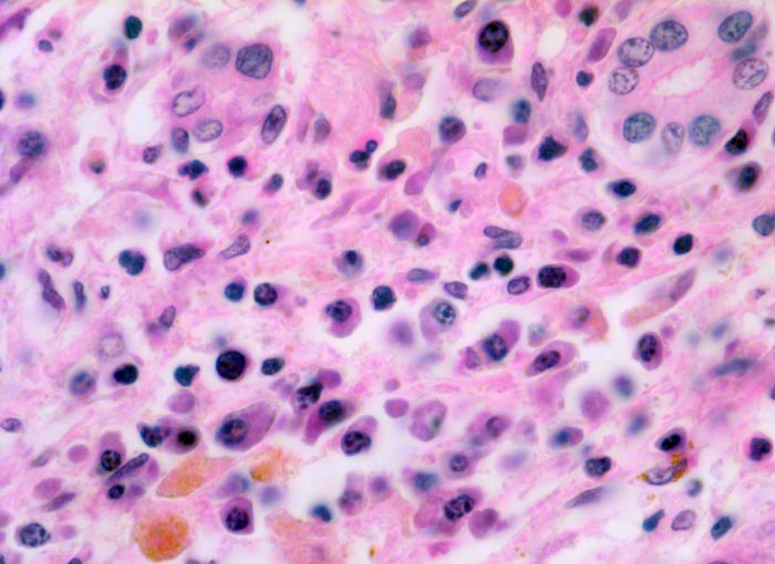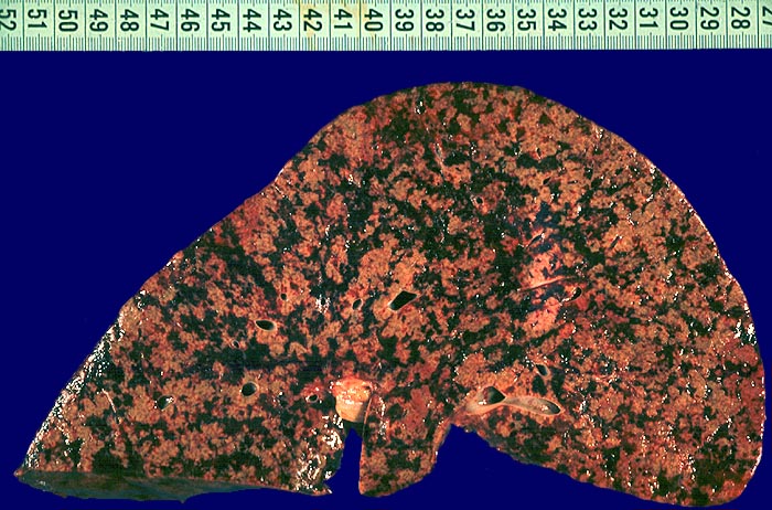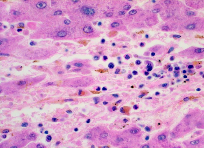 Das histologische Bild der akuten Hepatitis vom Virustyp ist gekennzeichnet durch eine lobuläre Entzündung bei fehlender portaler Fibrose und nur geringer entzündlicher Infiltration der Portalfelder. Es finden sich ballonierte Hepatozyten, Apoptosen ( 1164) und fleckige Nekrosen. Perivenuläre Nekrosen, Brückennekrosen oder konfluierende multilobuläre Nekrosen und eine läppchenzentrale Cholestase können vor allem in klinisch fulminant verlaufenden Fällen nachgewiesen werden. Zahlreiche Makrophagen, welche Diastase-PAS positives Zeroidpigment ( 4319) von phagozytierten nekrotischen Hepatozyten enthalten, zeugen im subakuten Stadium von einer abgelaufenen akuten Hepatitis mit Parenchymnekrosen. Eine Unterscheidung der verschiedenen Typen der viralen Hepatitis und einiger Formen medikamentöser Hepatitiden gelingt rein morphologisch aufgrund des unspezifischen Bildes meist nicht. Für eine ätiologische Klassifizierung sind zusätzliche klinische Angaben erforderlich (Anamnese, Medikamente, Serologie).
