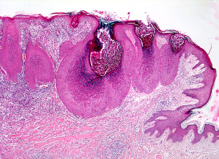Die Epidermis ist akanthotisch und kann bis zu 6 mal dicker sein als normal. Die Basalzellen sind etwas vergrössert und hochprismatischer. Das Molluscum Körperchen ist das Ergebnis einer viral induzierten Zytoplasmareaktion. Die multiplen intrazytoplasmatischen Einschlüsse enthalten Viruspartikel. Die Viruspartikel werden grösser in Richtung Granularzellschicht und verdrängen den Zellkern zur Seite. Die Dermis unterhalb des infizierten Molluscum Körperchens ist abgesehen von gelegentlich nachweisbaren Entzündungszellen unauffällig.
