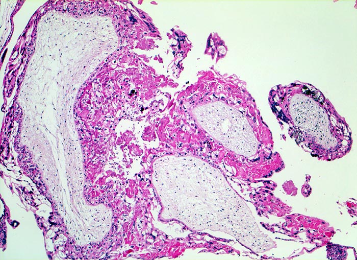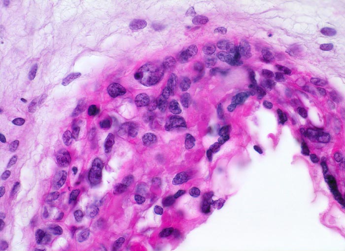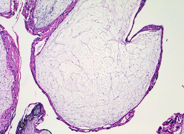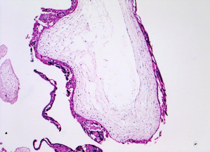 Morphologie: Makroskopisch ist die Plazenta deutlich grösser als erwartet für das Schwangerschaftsalter. Sie ist diffus von bis 2cm grossen Zottenblasen durchsetzt, welche nach Kollaps jedoch der makroskopischen Entdeckung entgehen können. Beim Aufschwemmen in Flüssigkeit entfalten sich die Blasen wieder. Mikroskopisch sind die Zotten aufgrund einer grobblasigen pseudozystischen Hohlraumbildung im Zottenstroma überwiegend grosskalibrig. Im Zottenstroma sind nur ganz vereinzelt Kapillaren nachweisbar. Im Gegensatz zu hydropisch geschwollenen Zotten im Sinne eines Regressionsphänomens zeigen die Zotten bei Blasenmole zusätzlich eine zirkumferentielle Hyperplasie von Synzytio- und Zytotrophoblast mit fakultativer Zellatypie. Bei herdförmiger Mole ( 3725) sind diese Veränderungen nur in einem Teil der Plazentarzotten ausgeprägt.