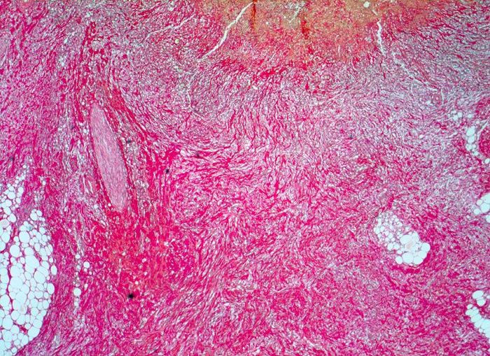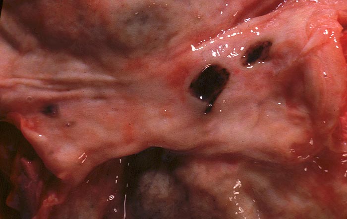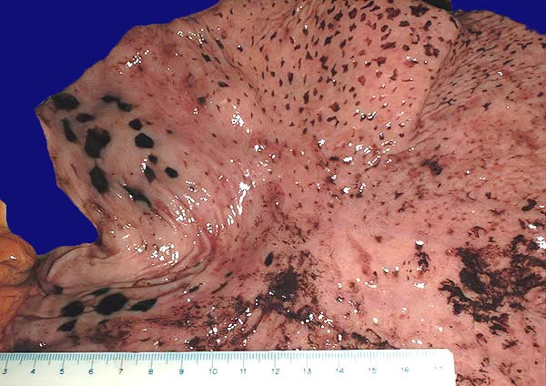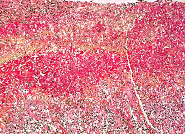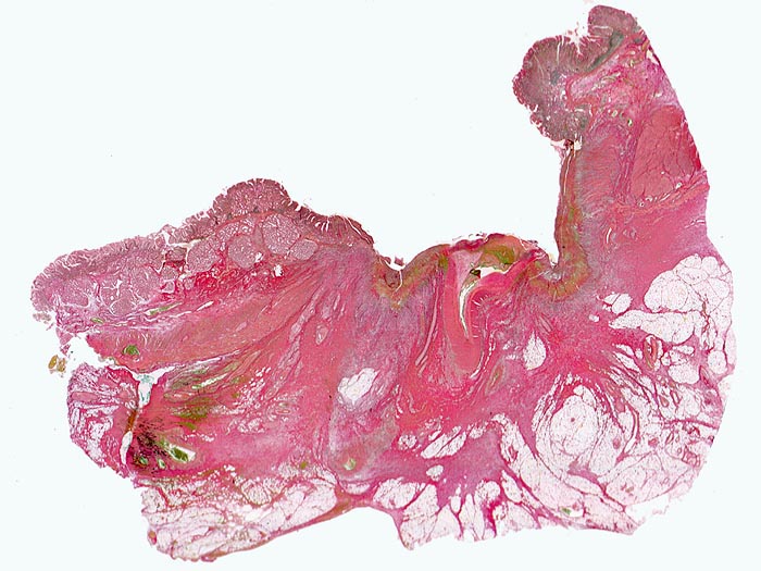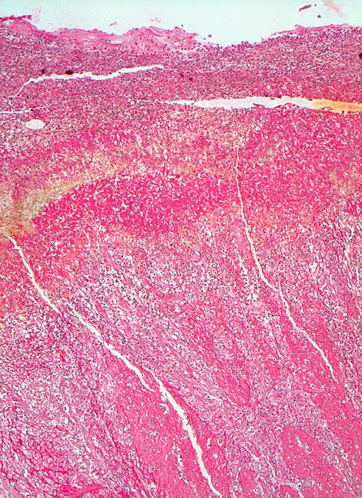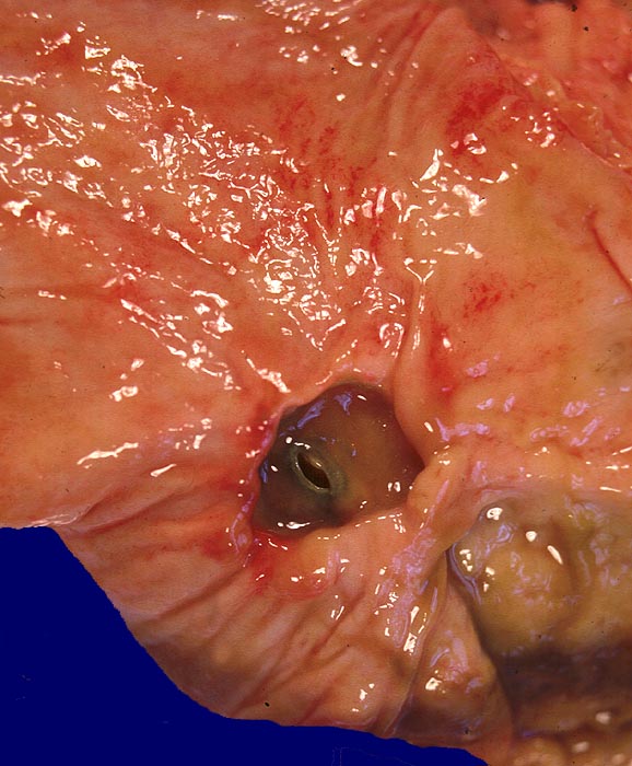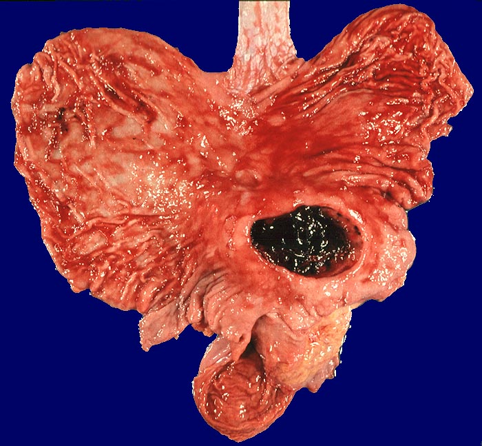 Das akute Ulkus ist rund, oval oder seltener polyzyklisch begrenzt und liegt meist im Schleimhautniveau. Das chronische Ulkus ist häufig kreisrund und im Längsschnitt trichter- oder treppenförmig. Die Schleimhautränder können lippenförmig über den Ulkusgrund hinausragen. Palpatorisch ist das chronische Ulkus aufgrund der narbigen Fibrose induriert. Die Schleimhautfalten laufen sternförmig auf das Ulkuszentrum zu. Das chronische Ulkus tritt zu 10%, das akute zu 25% multipel auf. Mikroskopisch zeigt das chronische Ulkus eine typische Schichtung (s. Bilder). Die Gefässe im Ulkusgrund zeigen eine starke Intimaproliferation mit teilweiser oder vollständiger Obliteration der Gefässlichtung. Morphologische Veränderungen in der übrigen Magenschleimhaut geben einen Hinweis auf die Ätiologie des Ulkus (Typ B oder C Gastritis).