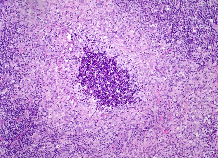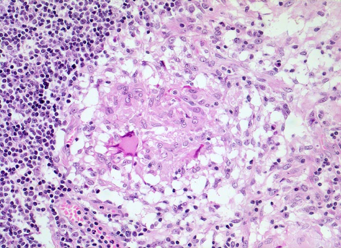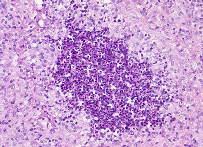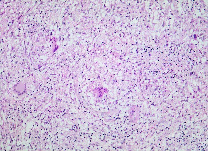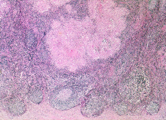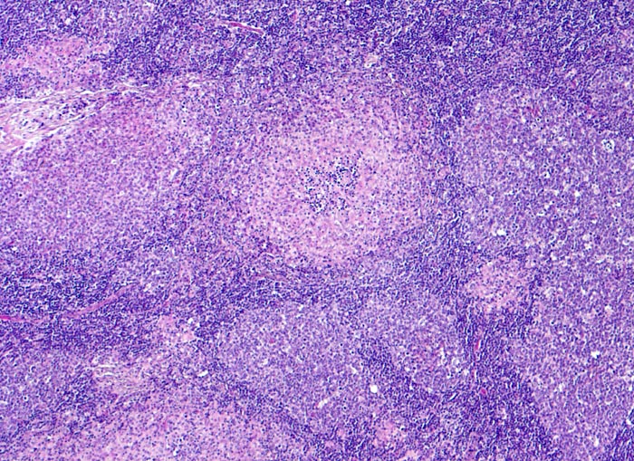 In der mittleren Dermis bilden sich Nekroseareale, welche von palisadierenden Histiozyten, mehrkernigen Riesenzellen und eosinophilen Granulozyten demarkiert werden. Die regionären Lymphknoten zeigen ebenfalls eine retikulozytär abszedierende Entzündung. Diese ist jedoch nicht spezifisch. Sie kommt auch vor bei Yersiniose, atypischer Mykobakteriose, Sporotrichose, Tularämie, Tumoren, Lymphogranuloma venereum und Coccidiomykose.
