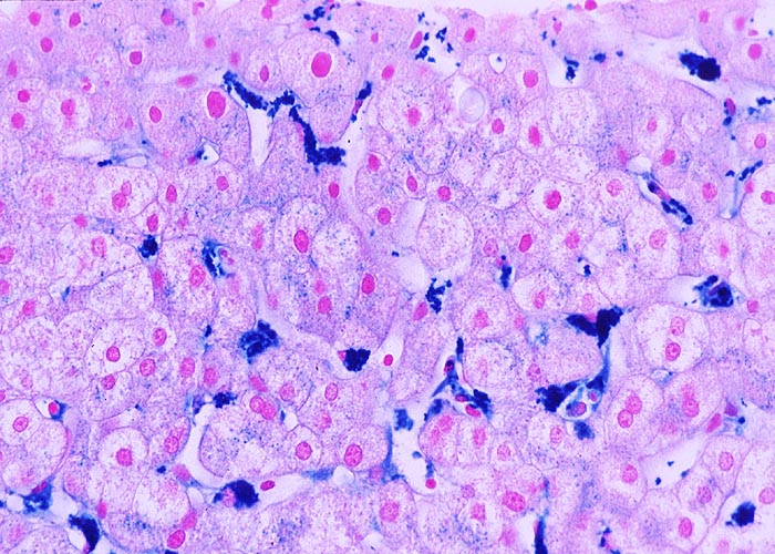 In der Eisenfärbung werden die Hämosiderin speichernden Kupffer'schen Sternzellen in den Sinusoiden gut sichtbar. In den Hepatozyten finden sich nur sehr geringe feinkörnige Eisenpigmentablagerungen.